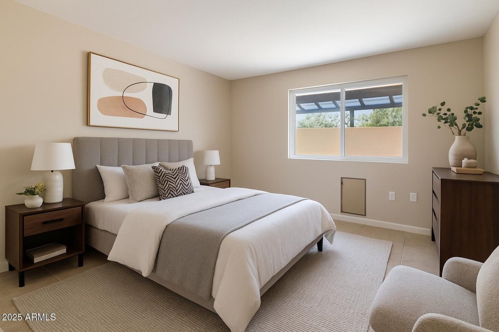 One of the very few 3 bedroom two bath homes priced under $500,000 in North Central Phoenix. Fresh updates include paint inside and out, carpet & windows throughout. Light-filled two-story townhouse with soaring 20-ft ceilings, fireplace, and a unique atrium for your own personal vegetable / herb garden. French doors lead to a private backyard retreat, situated close to the refreshing community pool. Updated kitchen with granite counters, cabinets and stainless steel appliances. Enjoy downstairs primary suite, with two additional bedrooms upstairs—ideal for guests and a home office. Easy care; HOA takes care of all exterior maintenance. 2 Car Garage. Private laundry room. Easy access to downtown Phoenix, excellent schools, popular Farmers Market and dining spots on 7th Street!